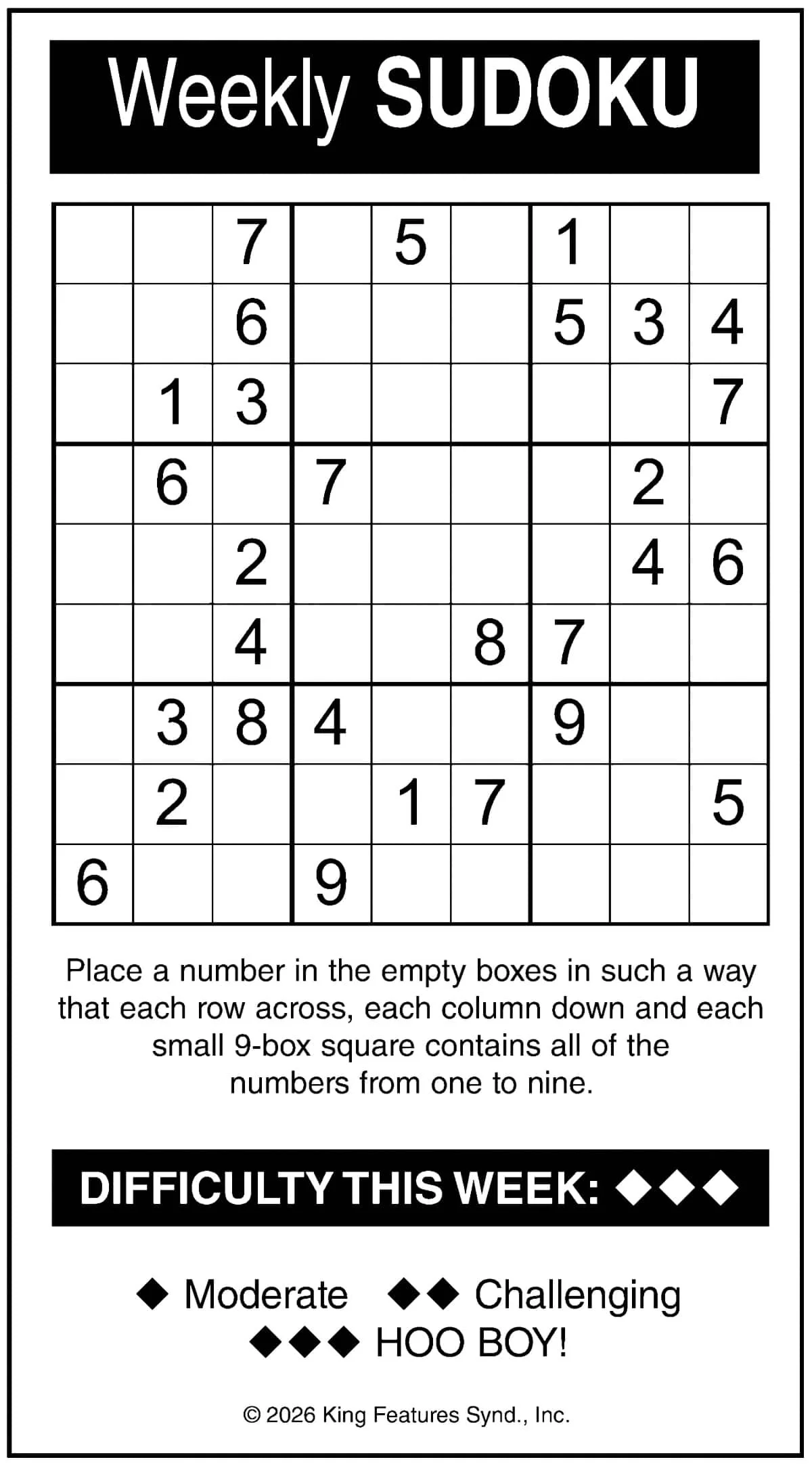 Weekly Sudoku: February 5 Fun & Games Feb 5 Written By Your West Central Voice Flex your math brain muscles with our weekly Sudoku puzzle! Answers below! Your West Central Voice