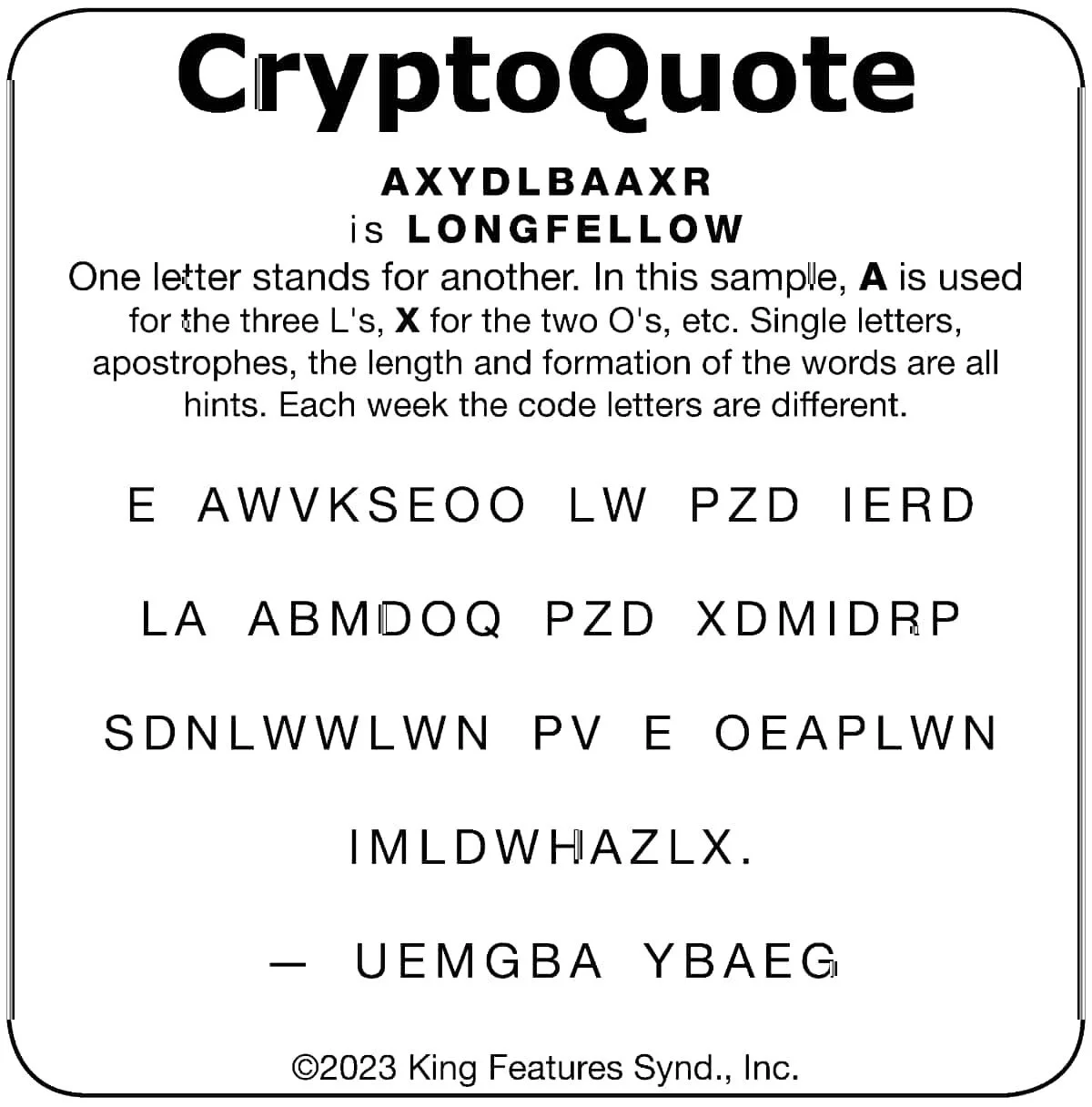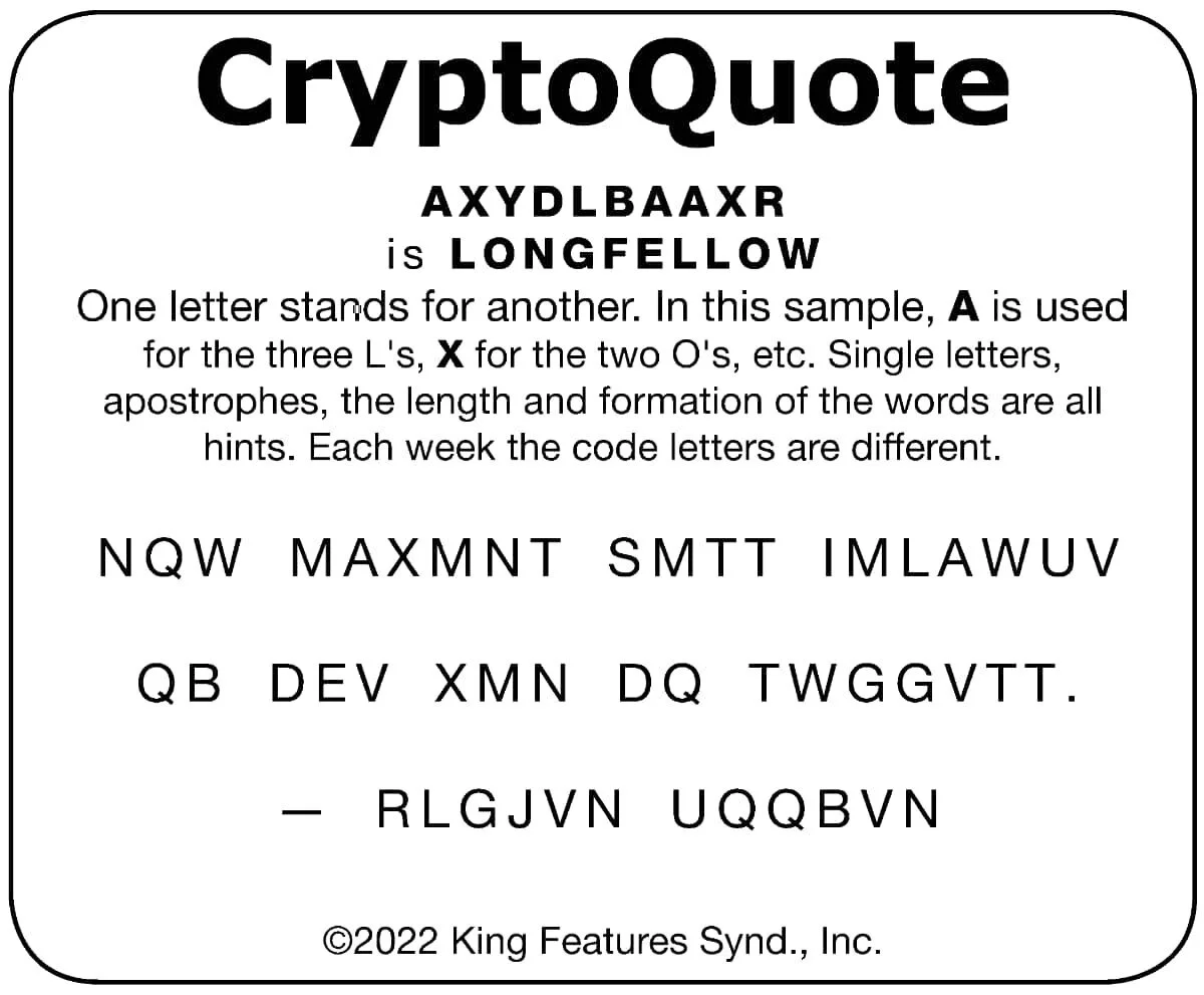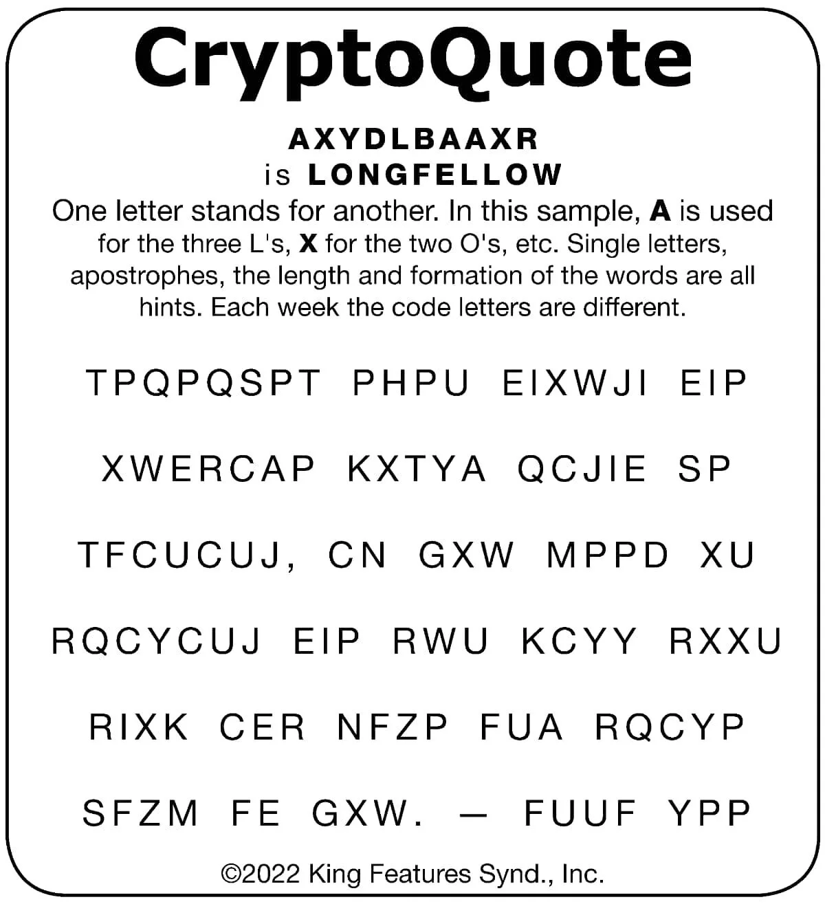 Have fun breaking the CryptoQuote! Each week the code letters are different.