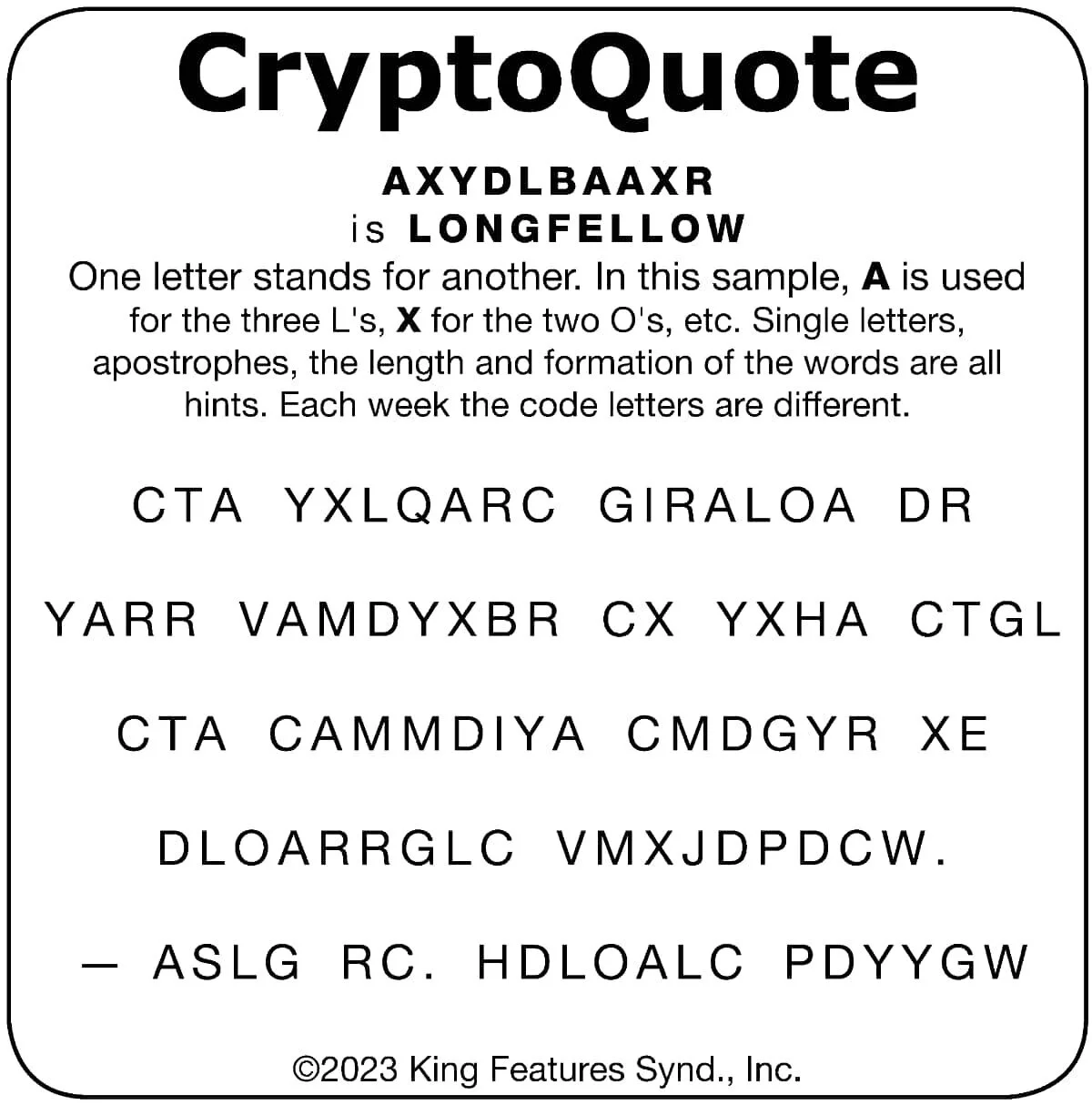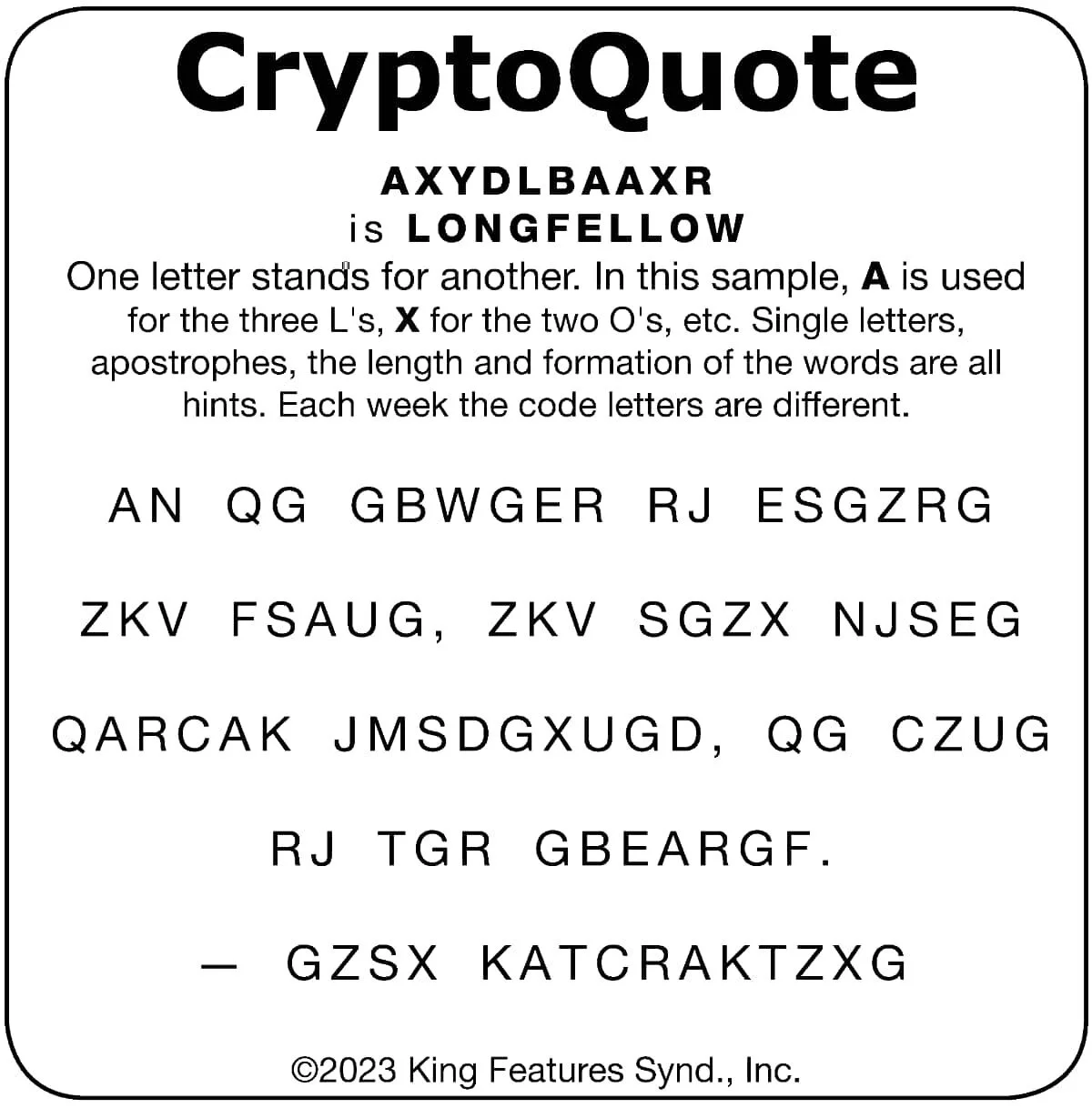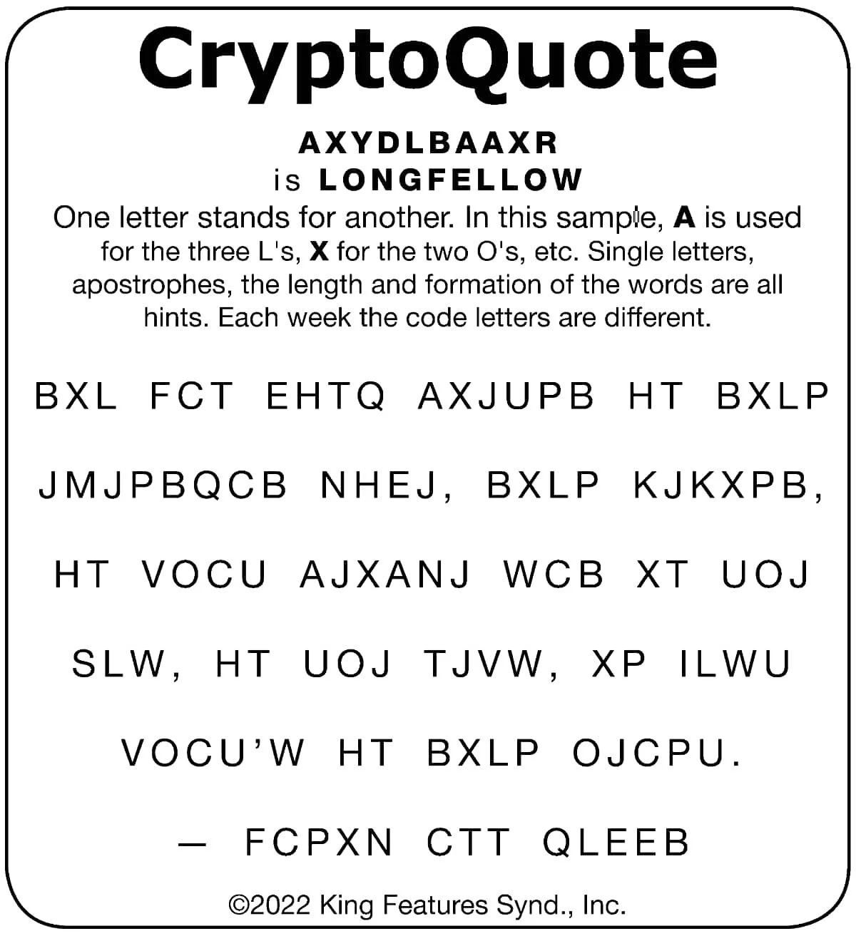 Have fun breaking the CryptoQuote! Each week the code letters are different.