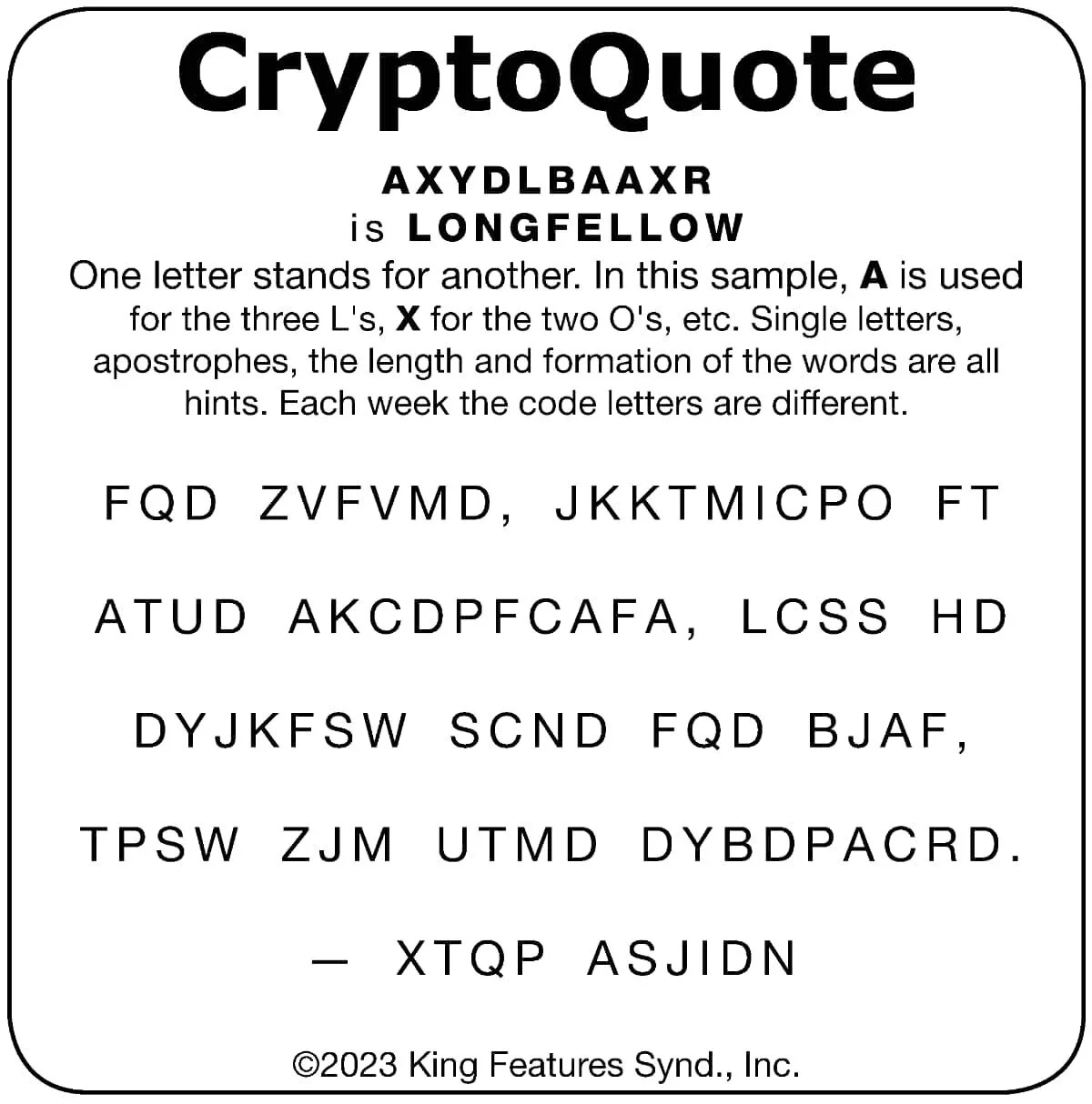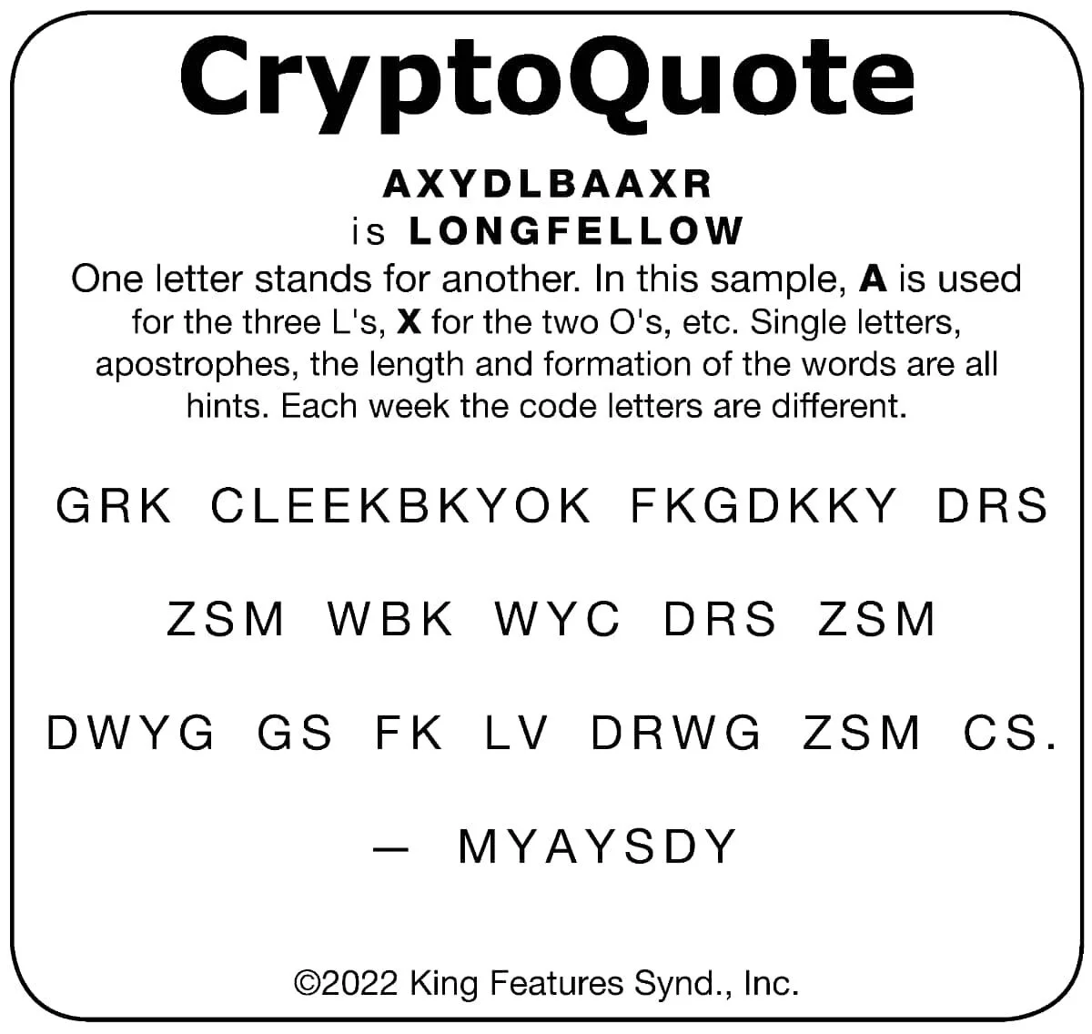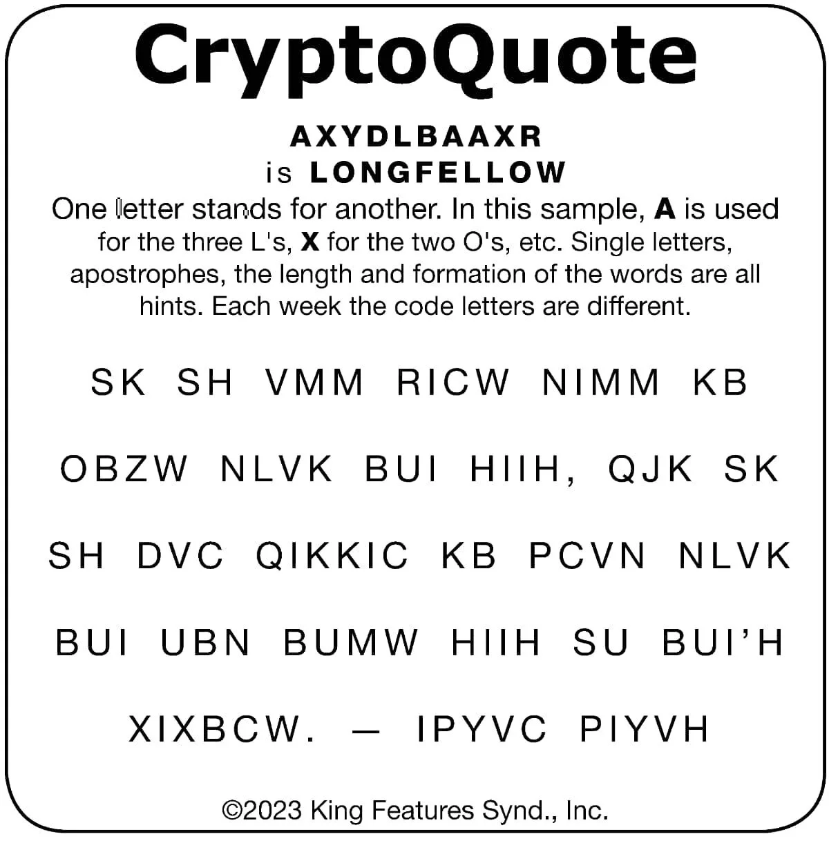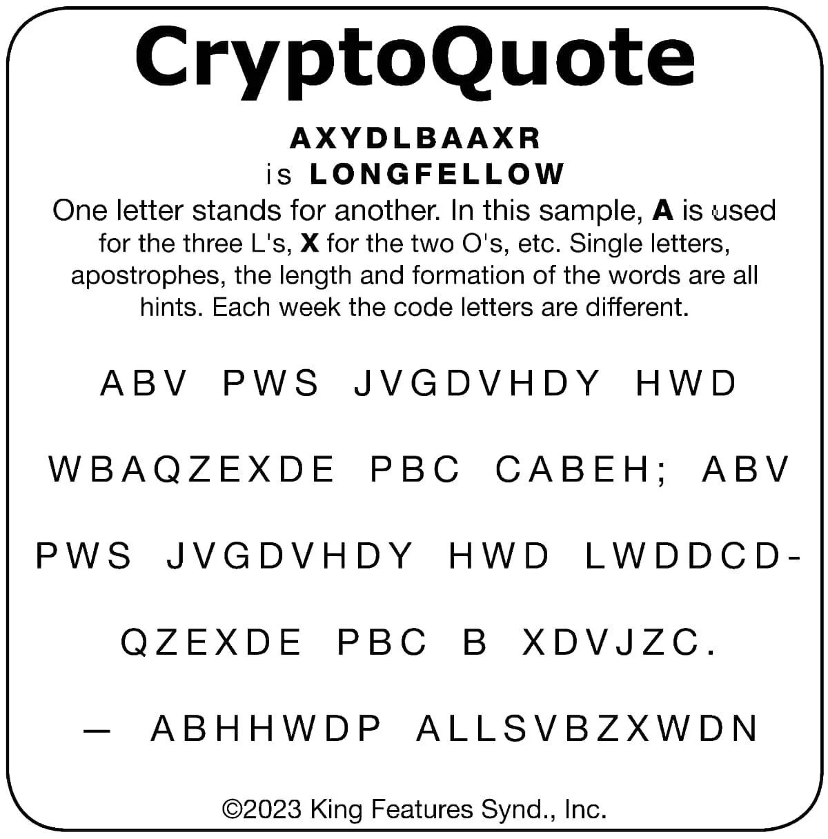 Have fun breaking the CryptoQuote! Each week the code letters are different.