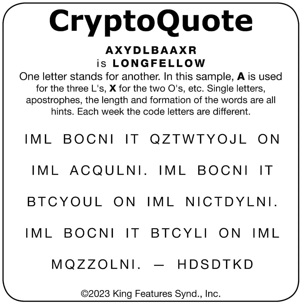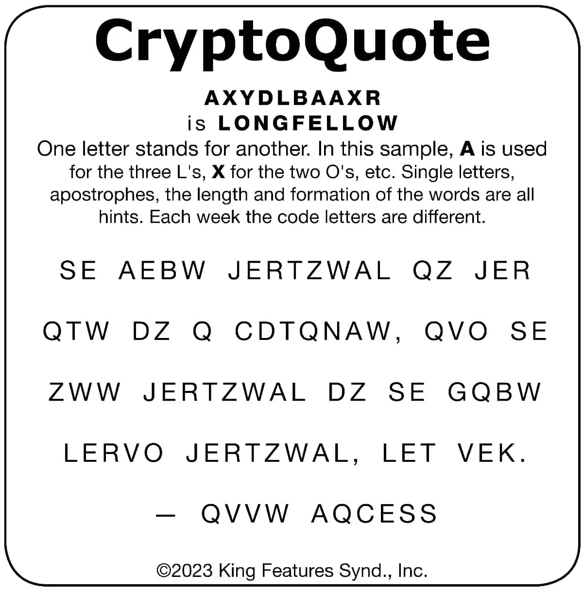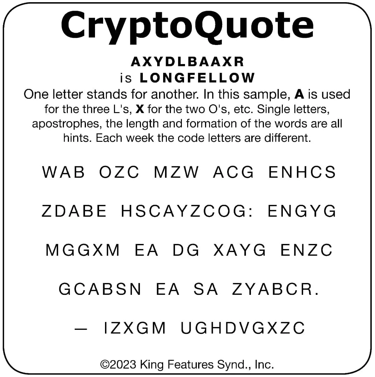 Have fun breaking the CryptoQuote! Each week the code letters are different.