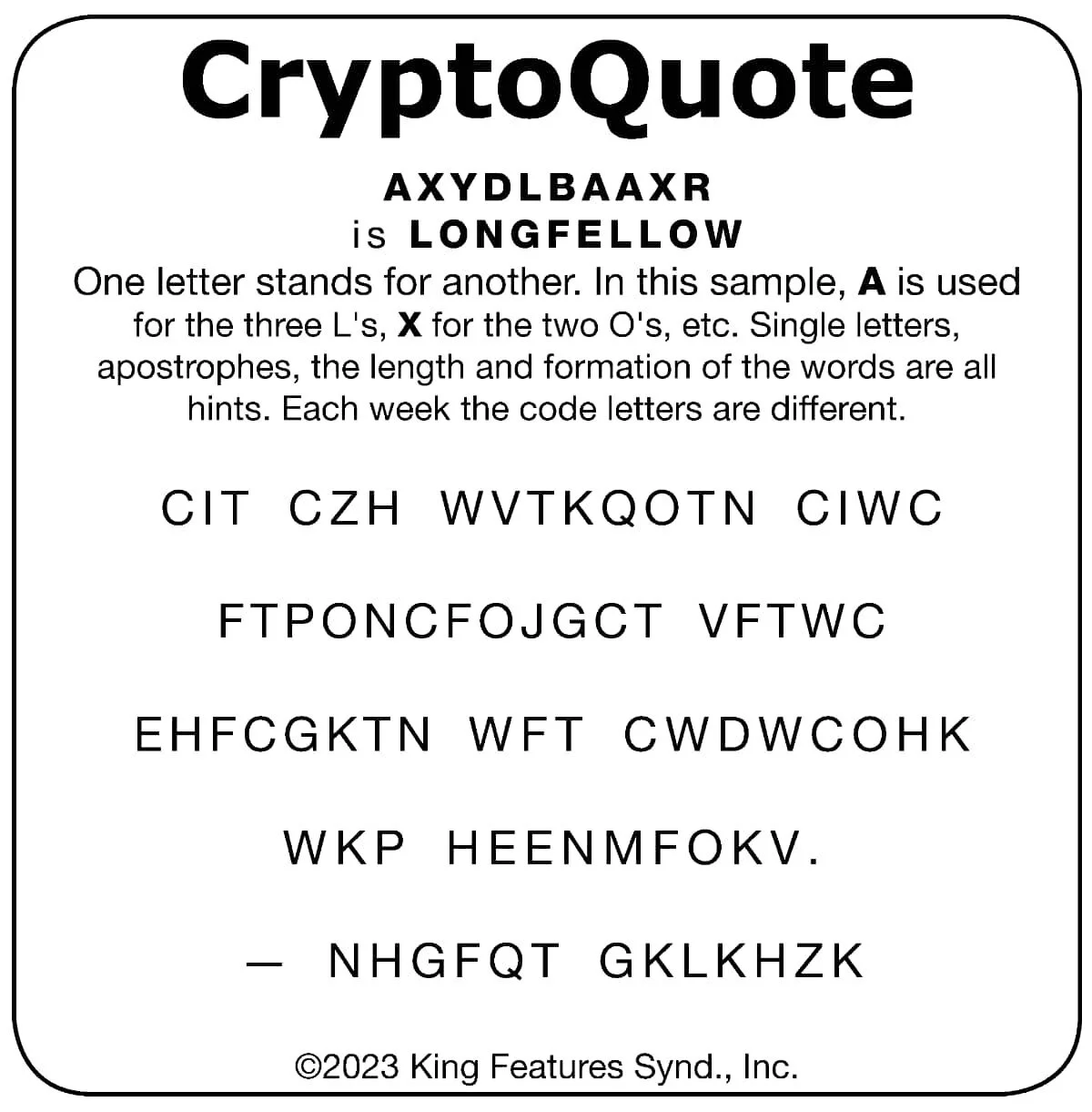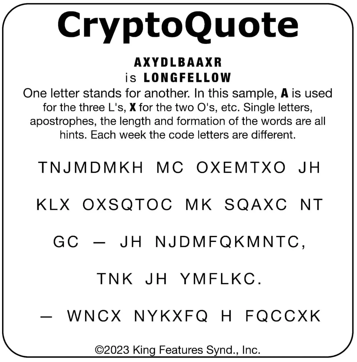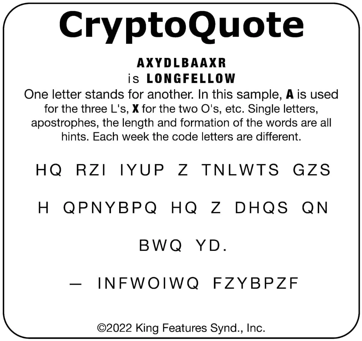 Have fun breaking the CryptoQuote! Each week the code letters are different.
