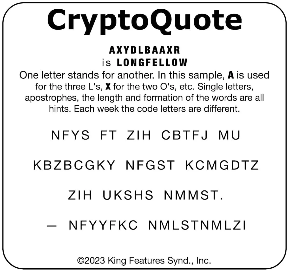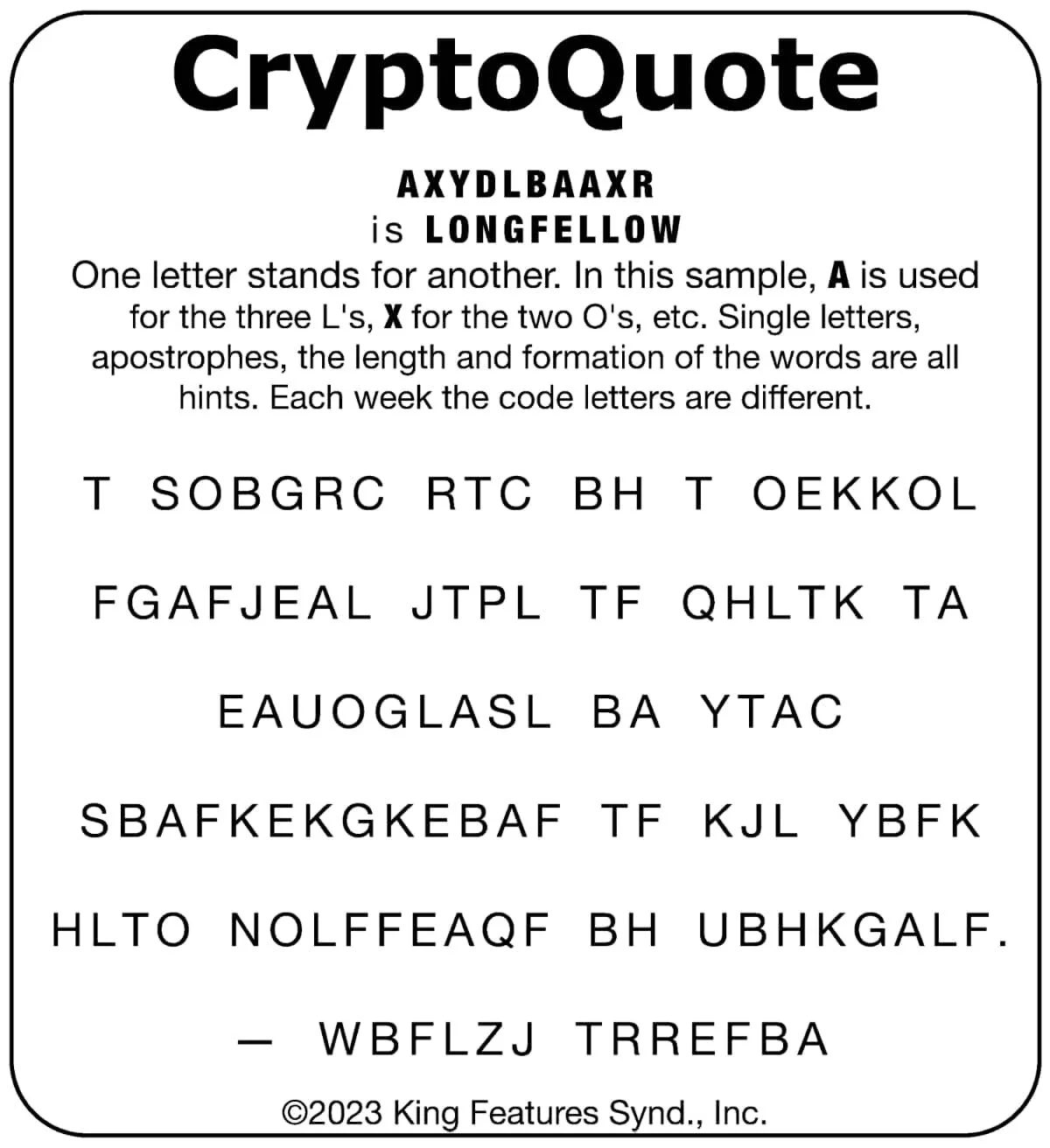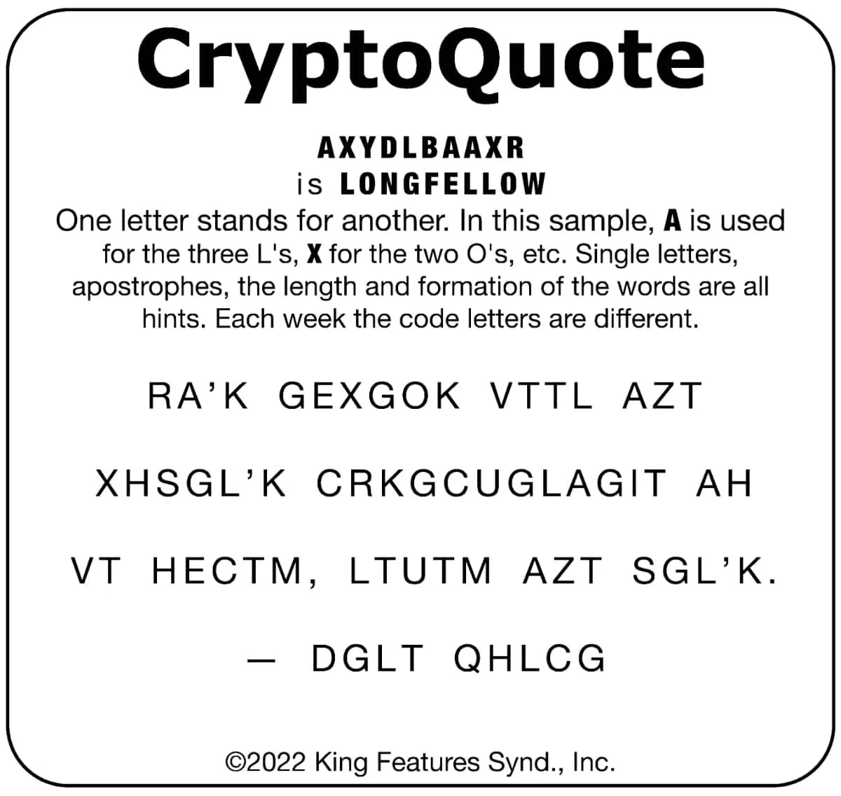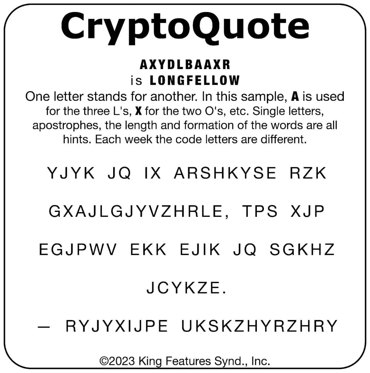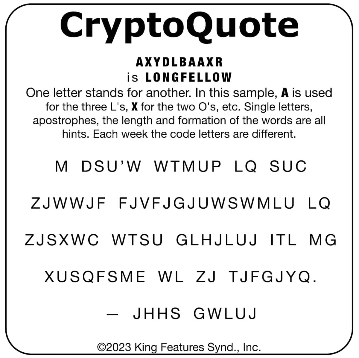 Have fun breaking the CryptoQuote! Each week the code letters are different.