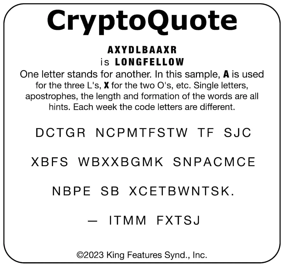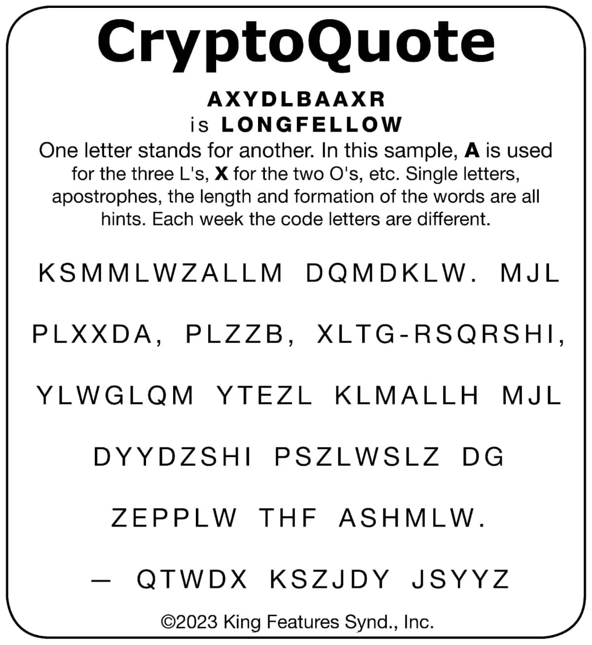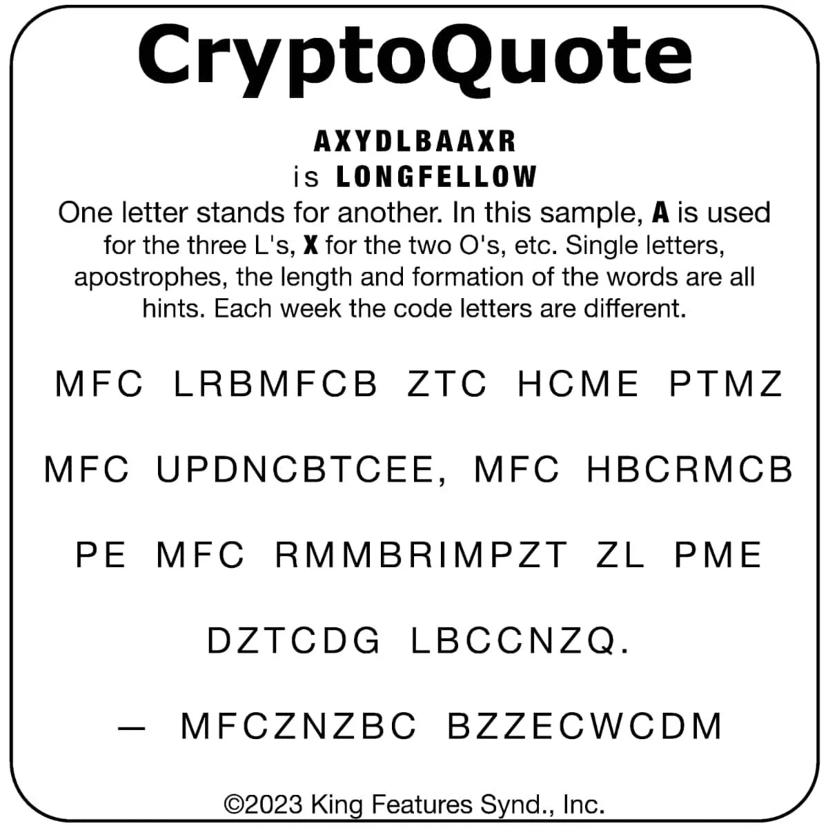 Have fun breaking the CryptoQuote! Each week the code letters are different.