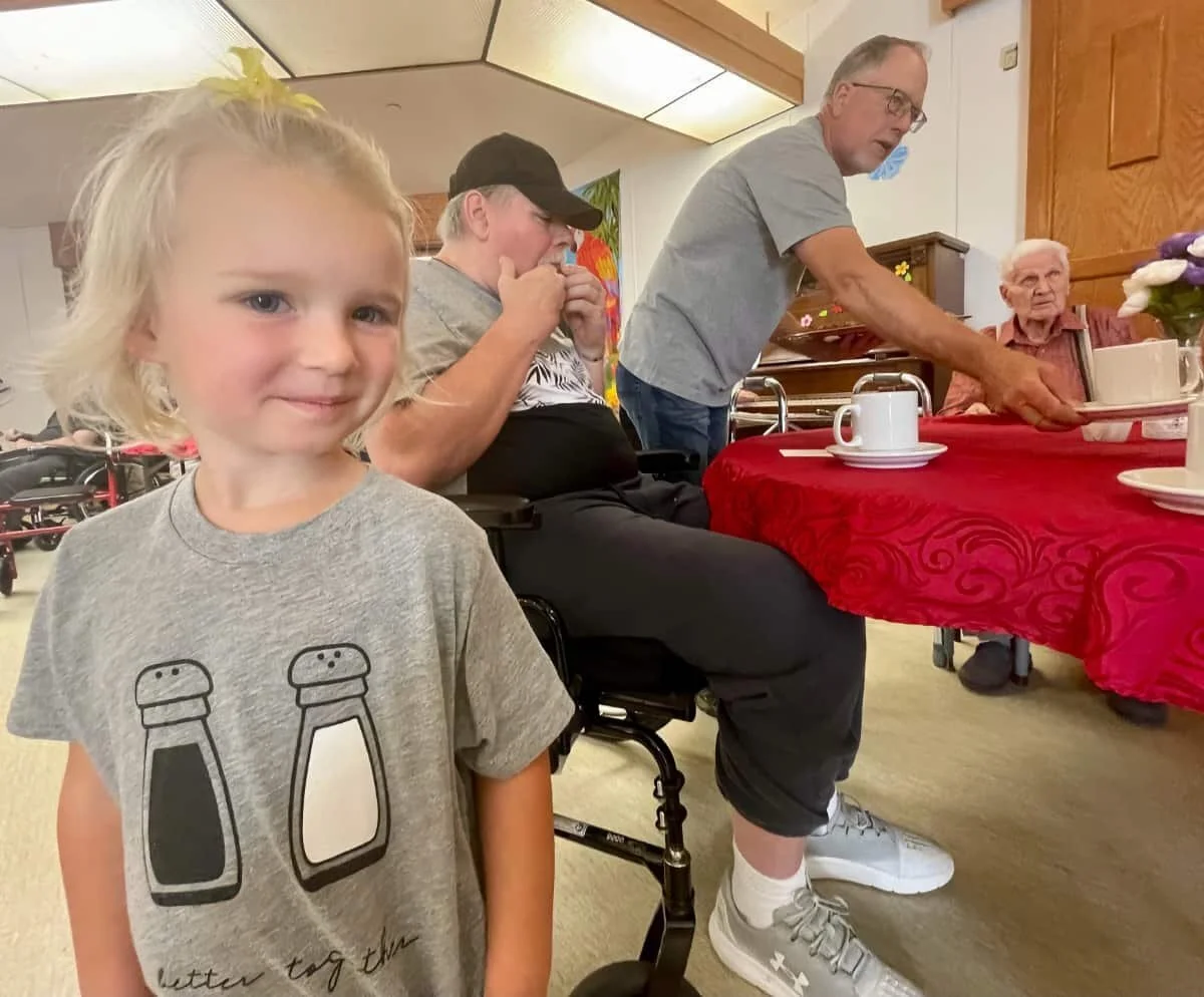 Little Esther spent the afternoon at Heritage Manor with her grandparents. Wearing their Better Together shirts they served the residents coffee and cake…