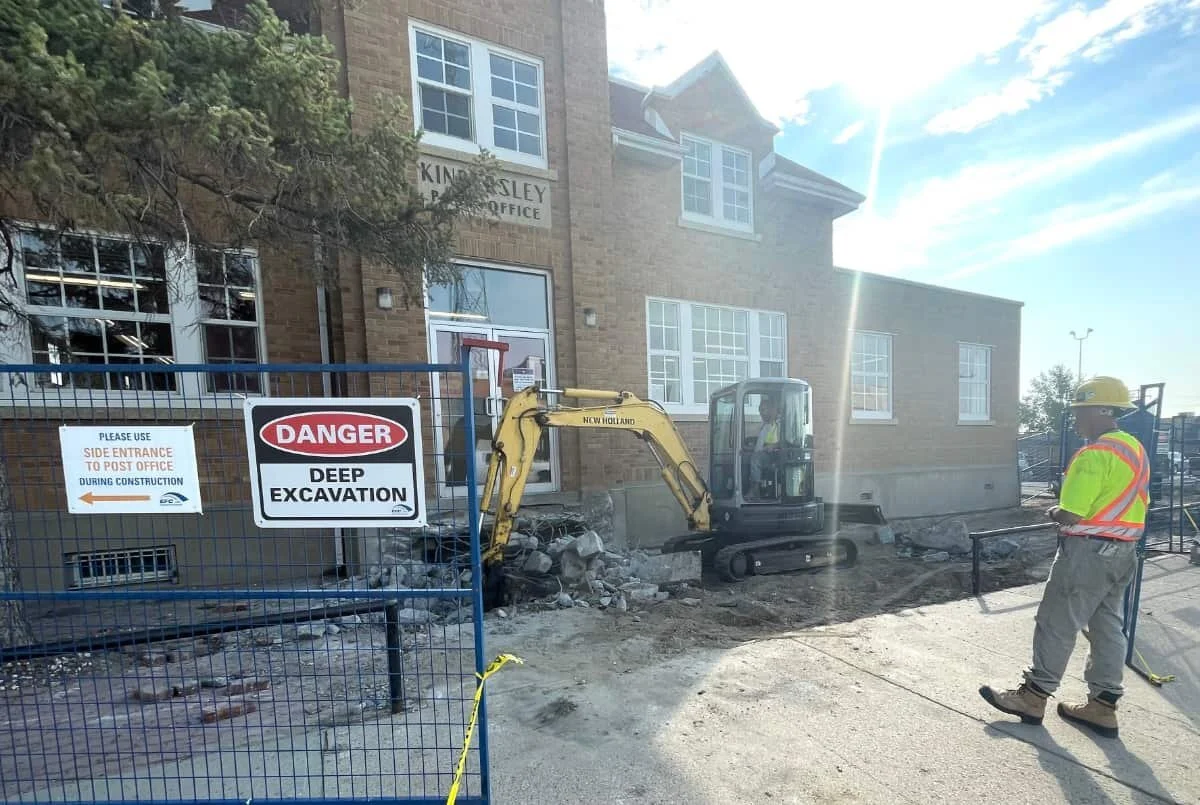 It was out with the old concrete steps, to make room for new steps at the Kindersley Post Office. The hot sun shone down on the crew as they began work on the project…