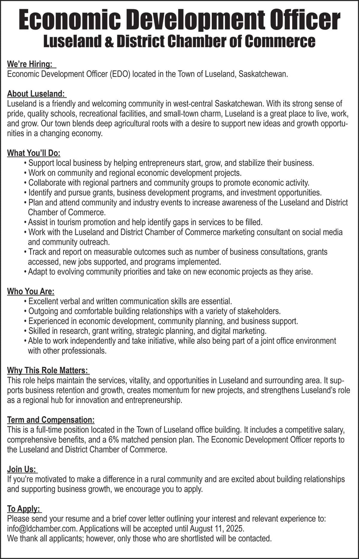 This is a full-time position located in the Town of Luseland office building. It includes a competitive salary, comprehensive benefits, and a 6% matched pension plan. The Economic Development Officer reports to the Luseland and District Chamber of Commerce.