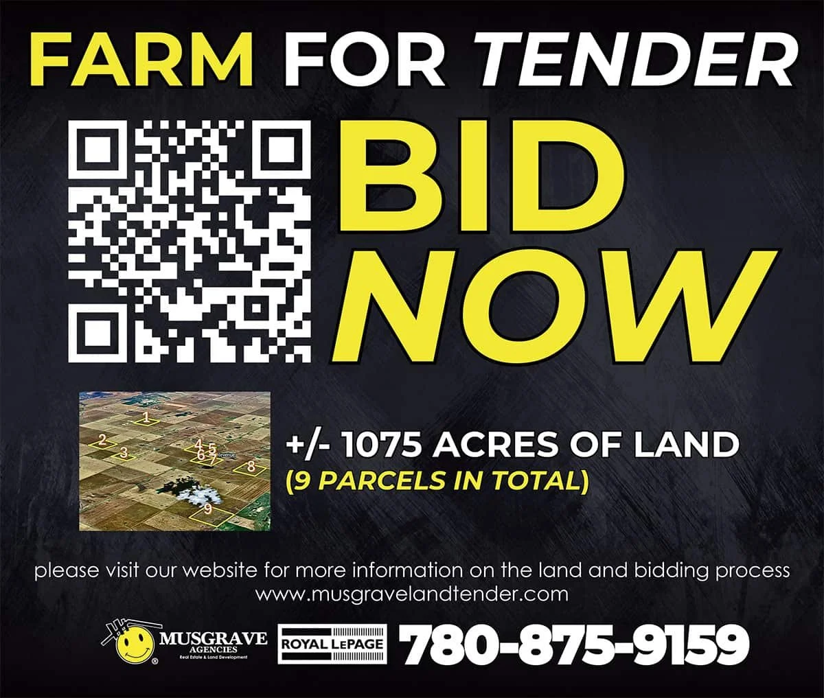 Please visit our website for more information on the land and bidding process www.musgravelandtender.com. 780-875-9159. Musgrave Agencies.