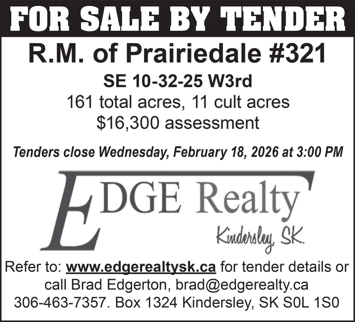 Refer to: www.edgerealtysk.ca for tender details or call Brad Edgerton, brad@edgerealty.ca, 306-463-7357. Box 1324 Kindersley, SK S0L 1S0