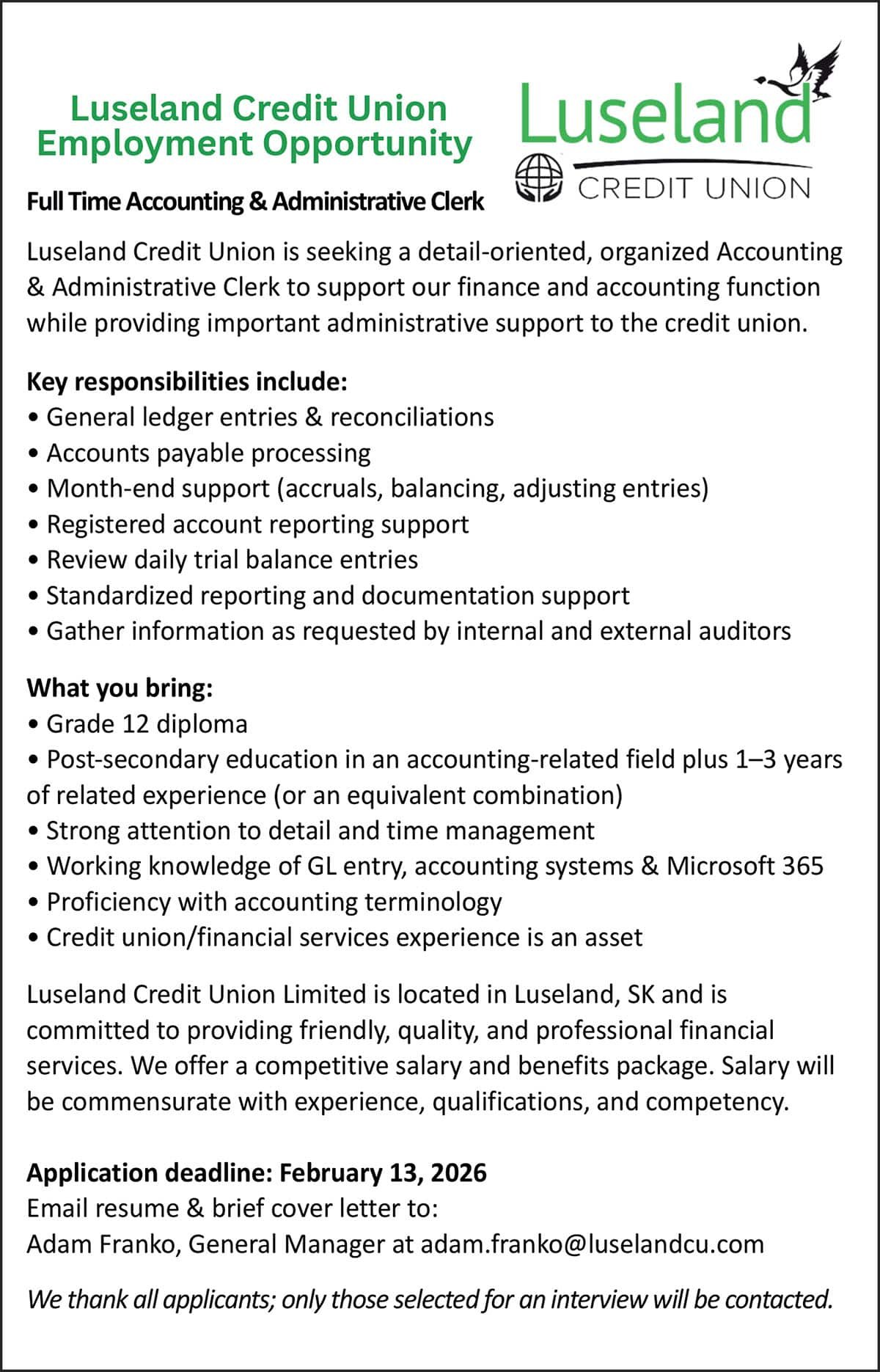 Luseland Credit Union is seeking a detail-oriented, organized Accounting & Administrative Clerk to support our finance and accounting function while providing important administrative support to the credit union.