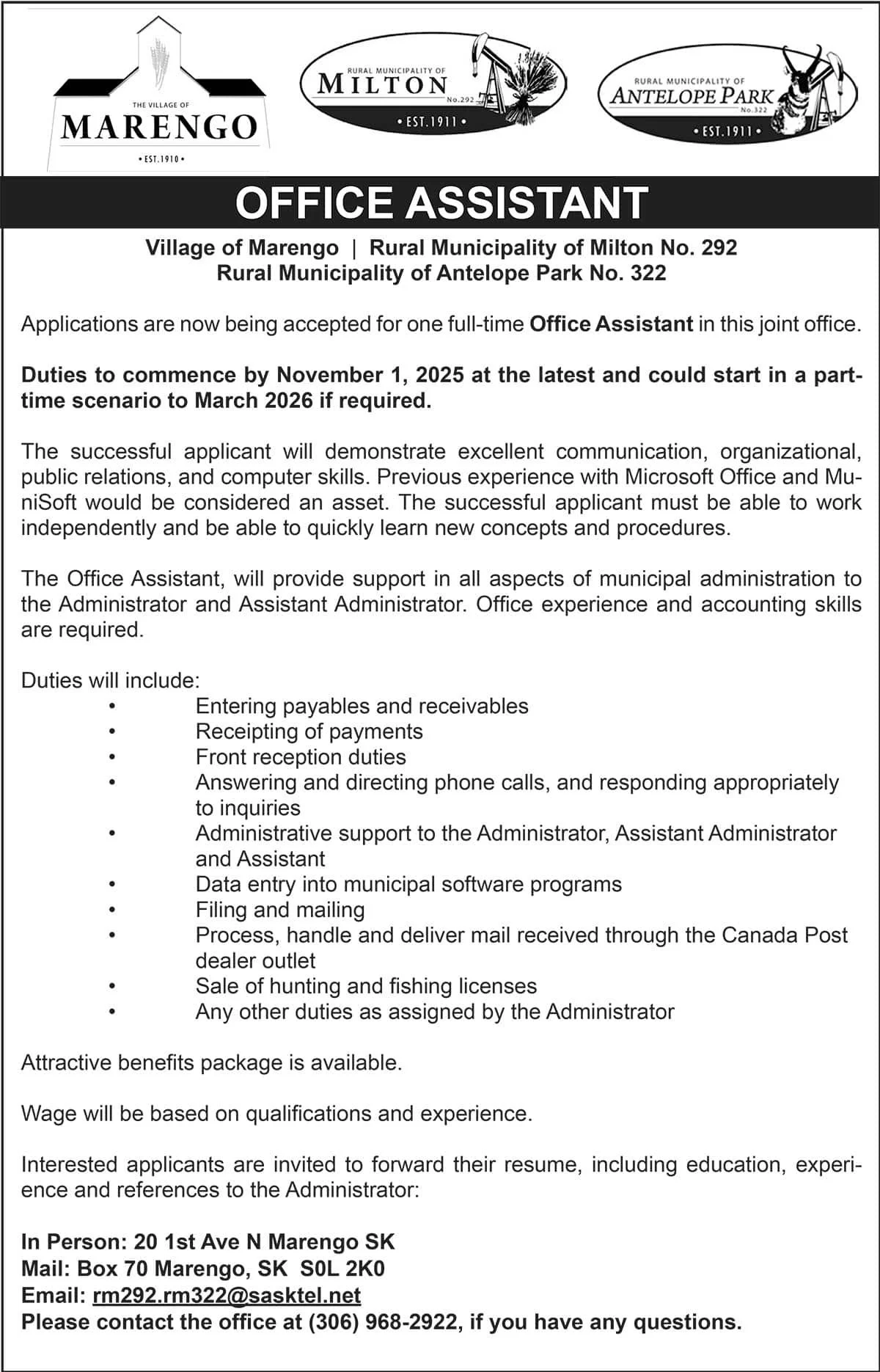 The Office Assistant, will provide support in all aspects of municipal administration to the Administrator and Assistant Administrator. Office experience and accounting skills are required.