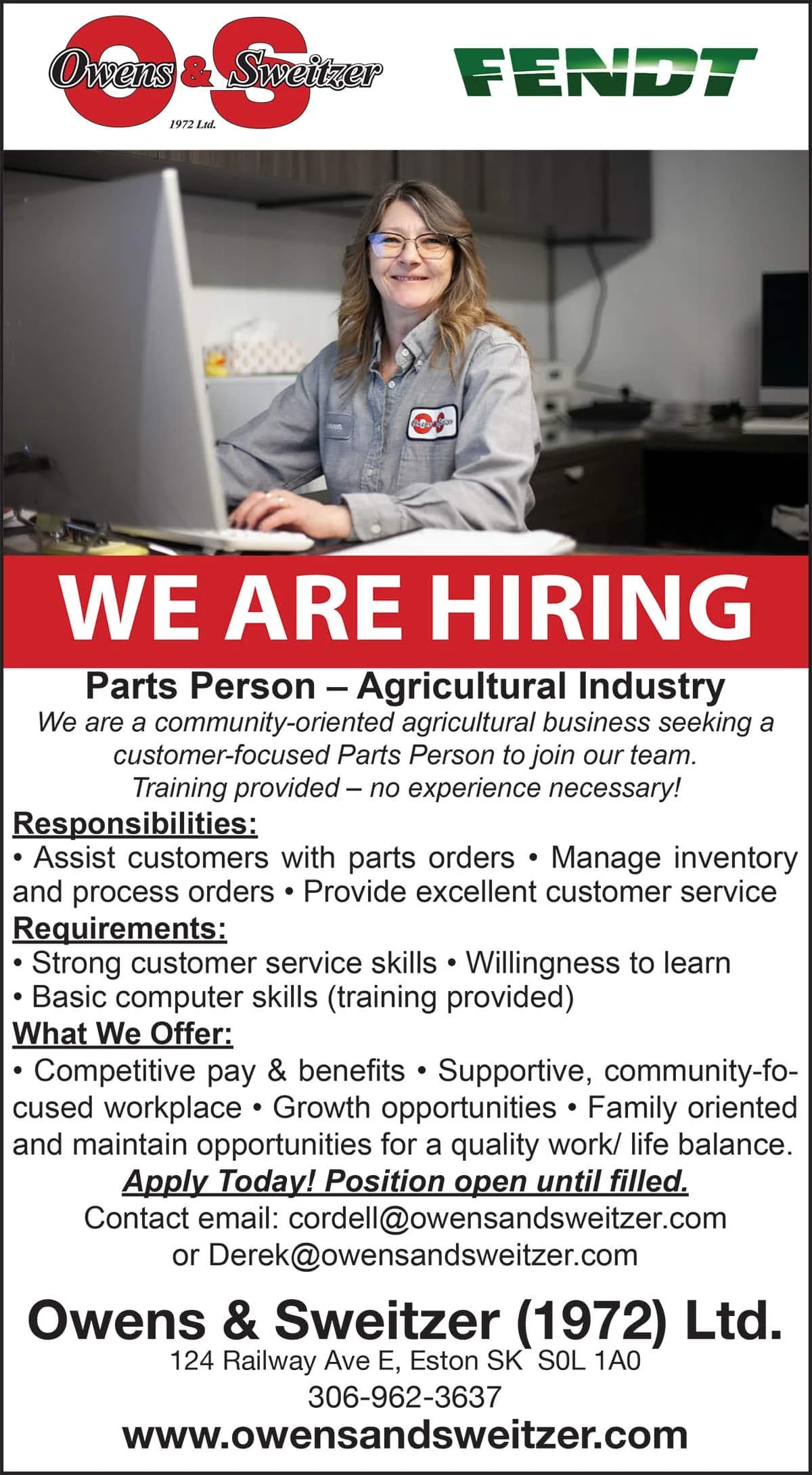 Owens & Sweitzer: WE ARE HIRING. Parts Person – Agricultural Industry