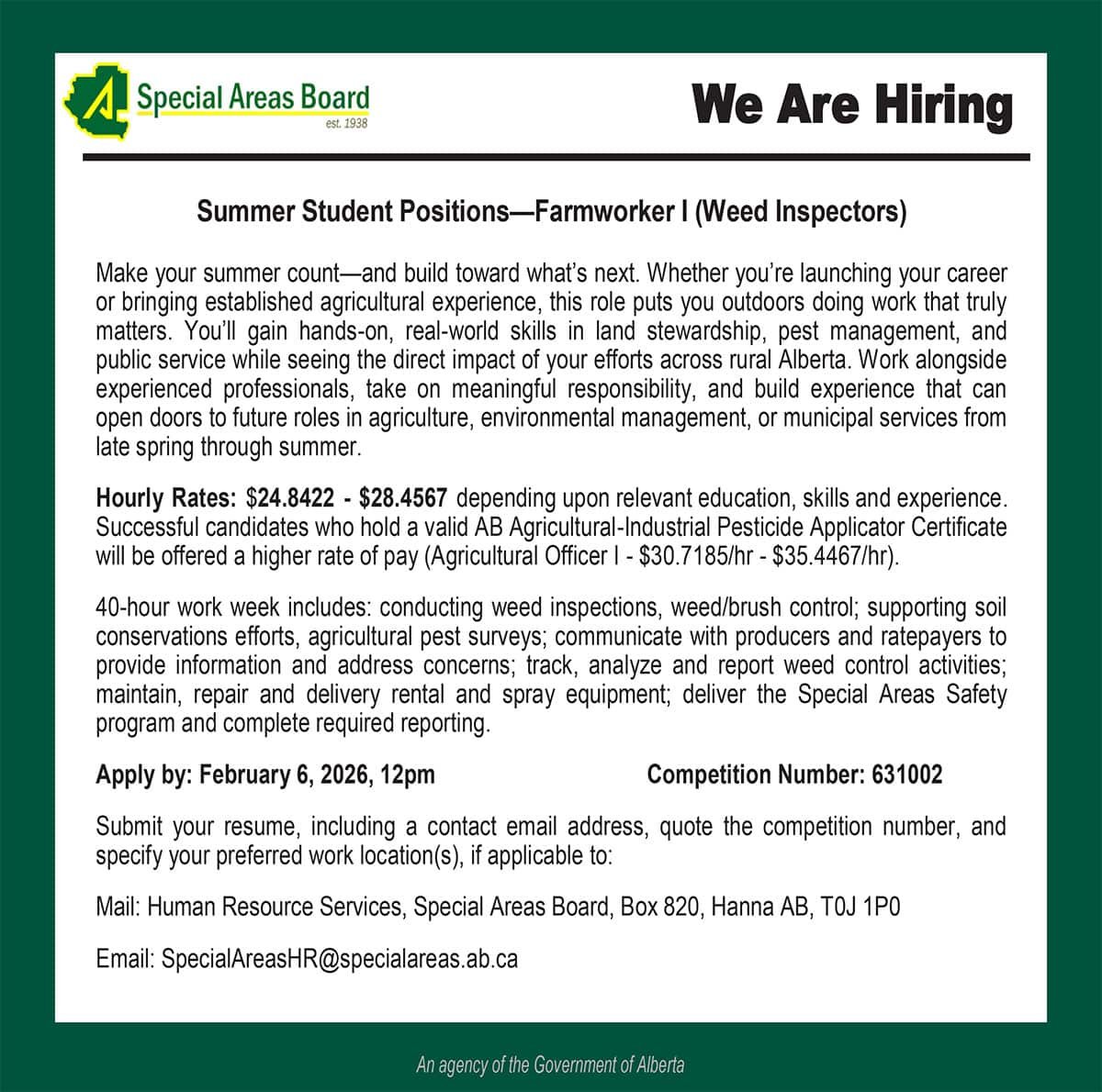 40-hour work week includes: conducting weed inspections, weed/brush control; supporting soil conservations efforts, agricultural pest surveys; communicate with producers and ratepayers to provide information and address concerns; track, analyze and report weed control activities; maintain, repair and delivery rental and spray equipment; deliver the Special Areas Safety program and complete required reporting.