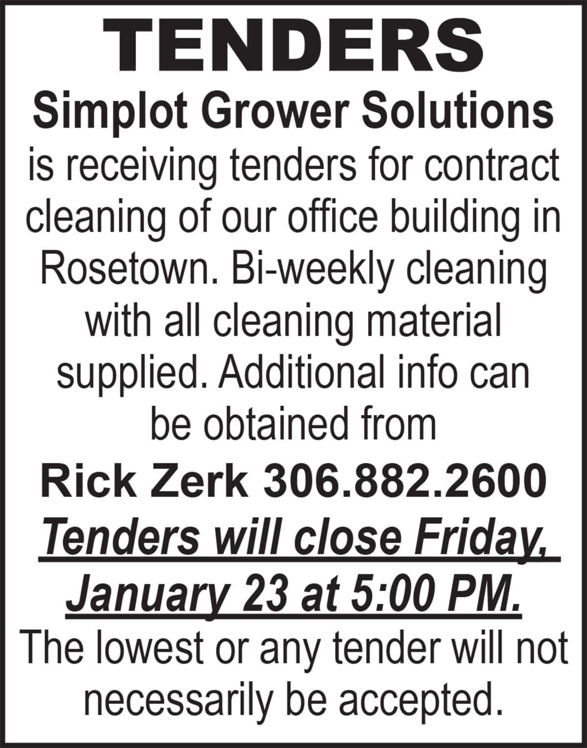 Simplot Grower Solutions is receiving tenders for contract cleaning of our office building in Rosetown. Bi-weekly cleaning with all cleaning material supplied. Additional info can be obtained from Rick Zerk 306-882-2600.
